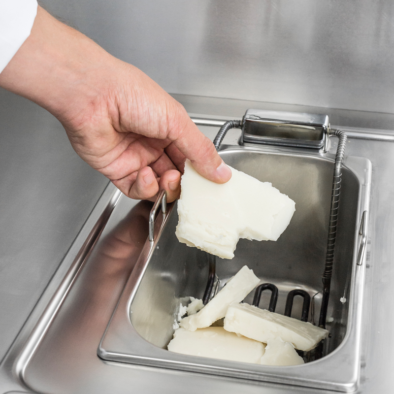 Защо трябва толкова внимателно да се занимаваме с тези твърди мазнини? При нагряване, мазнината започва да се разлага. Ако мазнината попада върху гореща повърхност, започва да дими и се зачернява. Този екстремен топлинен ефект значително намалява производителността на мазнината въпреки, че още не сме и напълнили фритюрника.