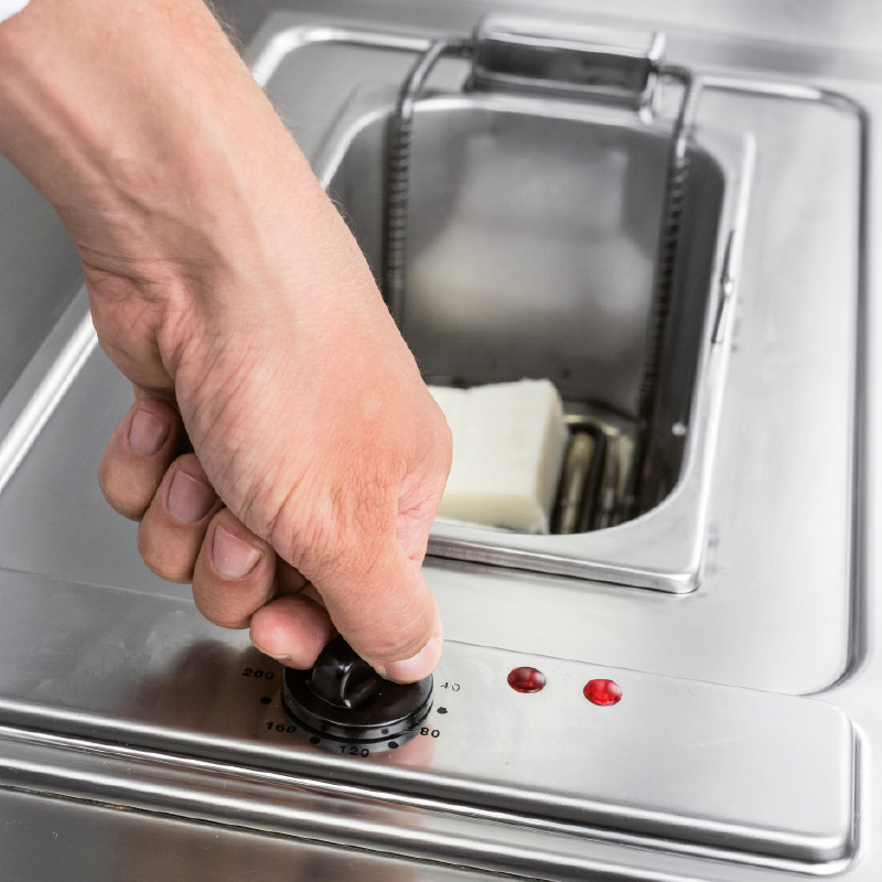 Твърдата мазнина трябва да бъде разтопена в отделен съд, преди да бъде поставена във фритюрника. Трябва да се внимава по време на разтопяването, за да се предотврати прегряването на мазнината. Ако достатъчно мазнини са се топили за да покрият нагревателите на фритюрника, да налеем разтопената мазнина във фритюрника! Да включим загревателя и да поставим малки парчета твърда мазнина във фритюрника, докато нивото на разтопената мазнина достигне индикатора за наситеност!